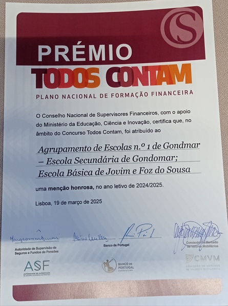 No passado dia 19 de Março, o Agrupamento de Escolas nº 1 de Gondomar foi distinguido com a Menção Honrosa para o 3º Ciclo do Ensino Básico, na 13º edição do Concurso “Todos Contam”, promovido pelo Conselho Nacional de Supervisores Financeiros e pelo Ministério de Educação, Ciência e Inovação, no âmbito do Plano Nacional de Formação Financeira, com o projeto “Construindo Riquezas: Passos para a Educação Financeira”.