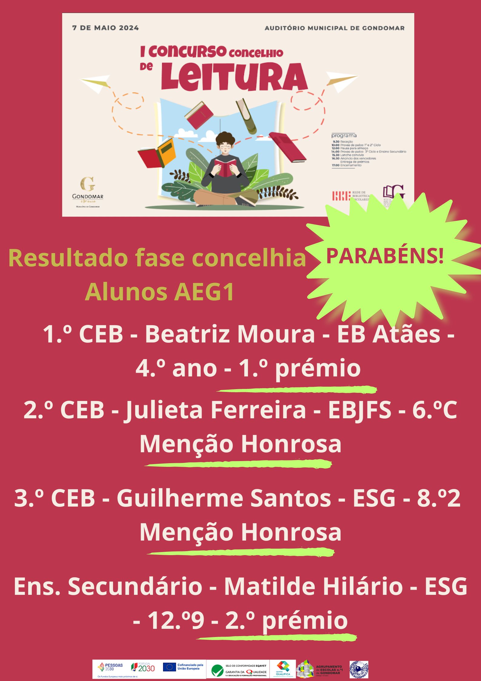 Decorreu no dia 7 de maio a fase concelhia do Concurso Concelhio de Leitura. O AEG1 esteve representado com um aluno por ciclo (1.º, 2.º e 3.º CEB e Secundário). Todos tiveram uma excelente prestação e estão de parabéns! A semana da leitura decorre de 18 a 22 de março. De entre as atividades a desenvolver destacam-se as seguintes: Concurso Concelhio de Leitura - fase agrupamento, feira do livro usado, exposição com livros e objetos relacionados com os mesmos e leitura de poemas. Em ano de comemoração do quinquagésimo aniversário do 25 de Abril, este será o tema estrutural na seleção dos poemas. Vamos celebrar a leitura!