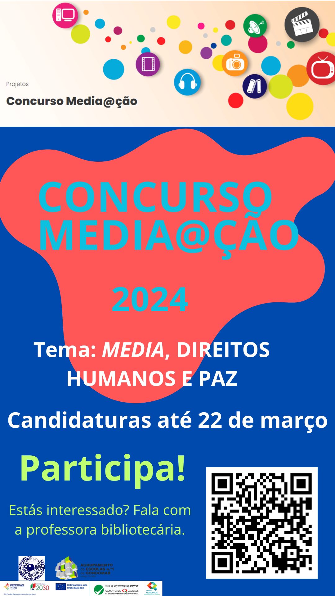 Está a decorrer a edição de 2024 do Concurso Media@ção.<br>O concurso Media@ção é uma iniciativa promovida pela Rede de Bibliotecas Escolares e pela Secretaria-Geral da Presidência de Conselho de Ministros em parceria com a Direção-Geral da Educação, o Centro Nacional de Cibersegurança, a Comissão Nacional da Unesco, o Plano Nacional de Cinema, o Plano Nacional de Leitura 2027 e a Associação DNS.PT. <br>O concurso destina-se a todos os alunos a frequentar o ensino básico e secundário que queiram refletir sobre a temática media, direitos humanos e paz e dar expressão à sua criatividade através de um vídeo, um podcast ou uma animação 2D ou 3D! <br>O prazo limite para envio dos trabalhos é o dia 22 de março de 2024. Participa!