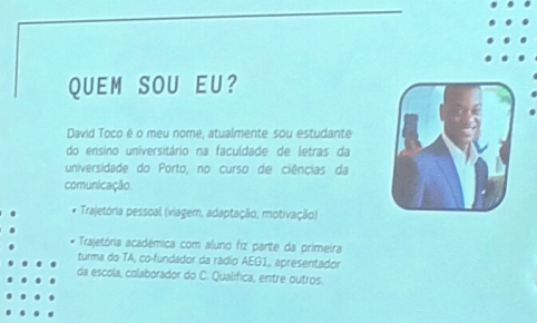 No passado dia 9 de outubro, pelas 9:10, o ex-aluno David do CPTA, apresentou aos colegas, do 12º Ano CPTGPSI, o seu percurso formativo e como ultrapassou as dificuldades.