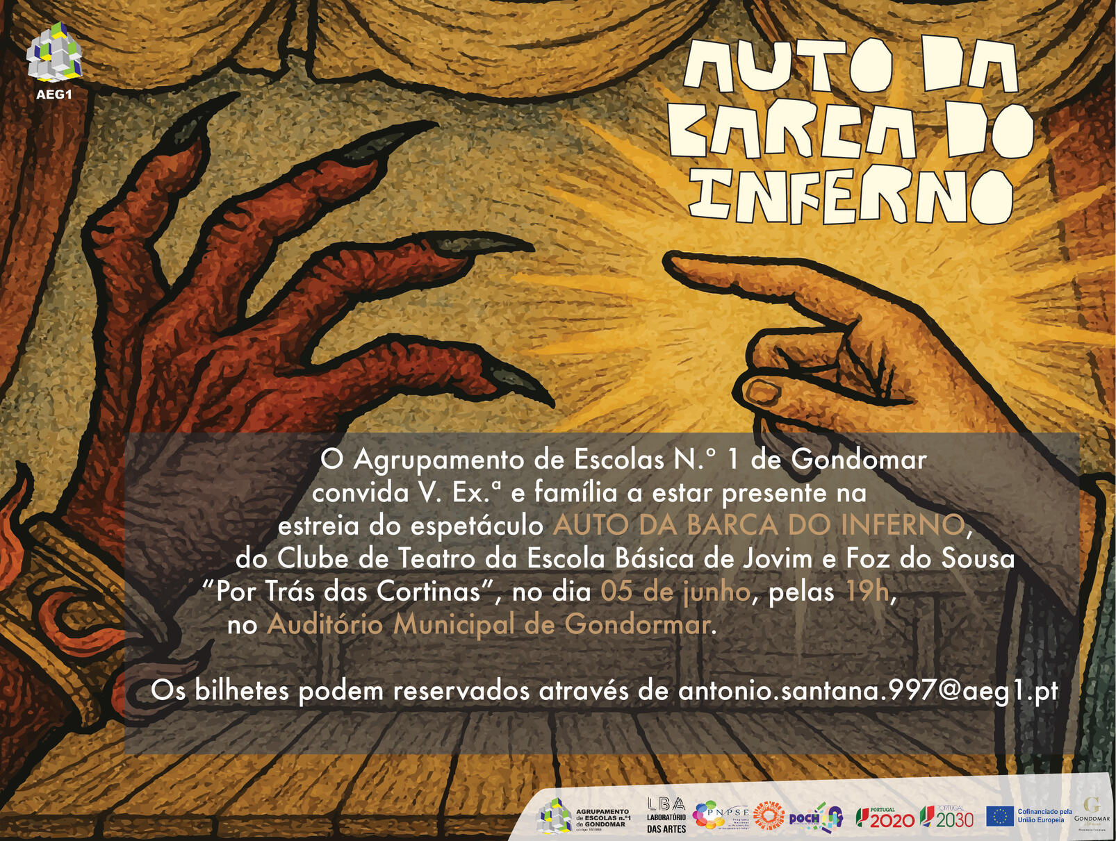 Convite para o espetáculo "AUTO DA BARCA DO INFERNO", a primeira produção do Clube de Teatro da Escola Básica de Jovim e Foz do Sousa.